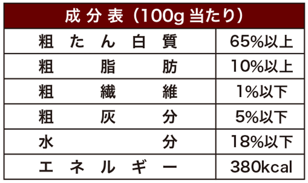 | 注意事項 | ●この製品は犬専用おやつ(間食用)です。●必要な栄養成分は生物によって異なりますので、犬以外のベットに与えないでください。●幼児や子供、ベットの触れない場所で保存してください。●ペットの体調が悪くなったときは、速やかに獣医師に相談してください。●給与量の体重を目安として1日2-3回に分け、おやつとして与えてください。●与える量は、犬種、大きさ、年齢、性質、運動量によって異なります。また、体質などによっても変化しますので、ペットの状態に合わせてお与えください。●ペットがおなかをこわしているときや体調が悪いときは与えないでください。●食べ残しや便の調子・健康状態をみて調整してください。●ベットの食べ方や性によっては喉に詰まらせることがありますので、観察しながらお与えください。●おいしさを保つために脱酸素剤が入っています。無害ですが食品ではありません。食べさせないようにご注意ください。●製造工程上、色・形状・サイズなどに多少のばらつきがあります。無添加国内産おやつ♪鶏砂肝! |
