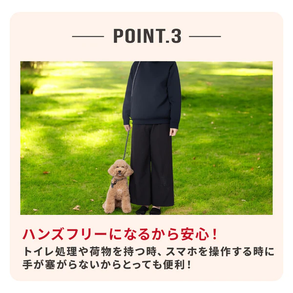 家の出入り時や、お散歩中のトイレ処理、給水やおやつ時、荷物や傘やスマホを持たなければならない時に手が塞がらないので便利。
